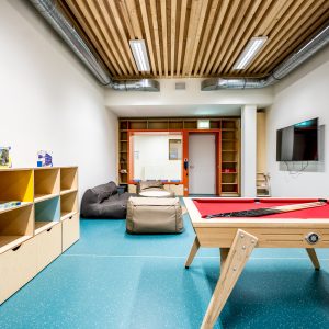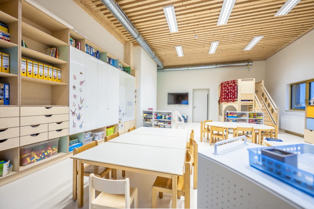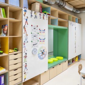 Les locaux sont équipés de mobilier sur-mesure au design pratique, dynamique et coloré. Adaptée à chaque classes, la typologie de la menuiserie est cohérente à travers toute l’école. Le mobilier volant a été étudié en détail pour répondre aux besoins de tous les occupants (des plus petits au plus grands). Assises dynamiques, tables réglables en hauteur et multifonctions, zones de détente et de jeux, … font partie des atouts de cette école innovante.